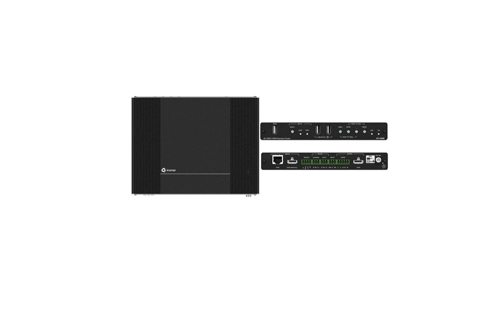 KIT 500 is a high−performance integrated matrix scaler kit, consisting of the KIT 500T matrix transmitter with two USB−C and two HDMI/USB inputs independently routable to HDMI and HDBT outputs, and the KIT 500R auto−switcher scaler receiver with an HDMI input for routing a local signal and an HDBT input for routing a remote signal (from the KIT 500T transmitter). The remote USB peripherals (such as a room camera) are extended for use of local USB host for convenient hybrid meeting operation with both room and online participants.