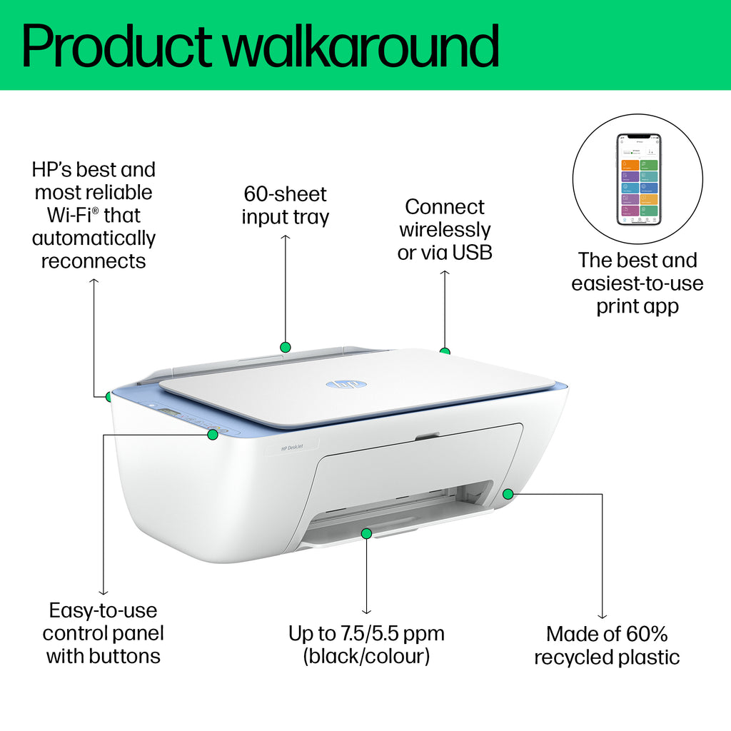 Eenvoudig en moeiteloos printen.[1] Print, scan en kopieer moeiteloos met deze compacte draadloze printer, gekoppeld aan de beste en meest gebruiksvriendelijke printapp. Van retouretiketten tot je favoriete recepten geniet je van een naadloze ervaring van het nummer 1 printerbedrijf ter wereld.